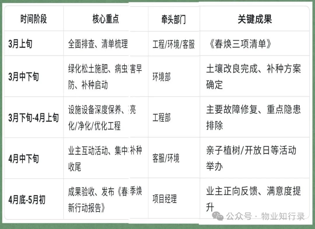 真正的春季焕新,是一场从“功能恢复”到“体验升级”的系统工程,更是全年业主满意度的奠基之战。它需要工程、环境、客服、安保四条线协同作战,用看得见的变化,唤醒业主对家园的新认知。